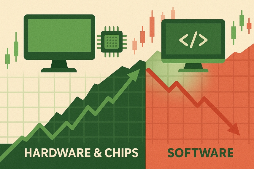 Hardware stocks benefit from secular growth in cloud infrastructure and networking equipment, but they also offer steadier earnings relative to many software firms. Apple’s P/E ratio, around 35, is elevated yet lower than that of many software peers, suggesting that investors still demand earnings support.